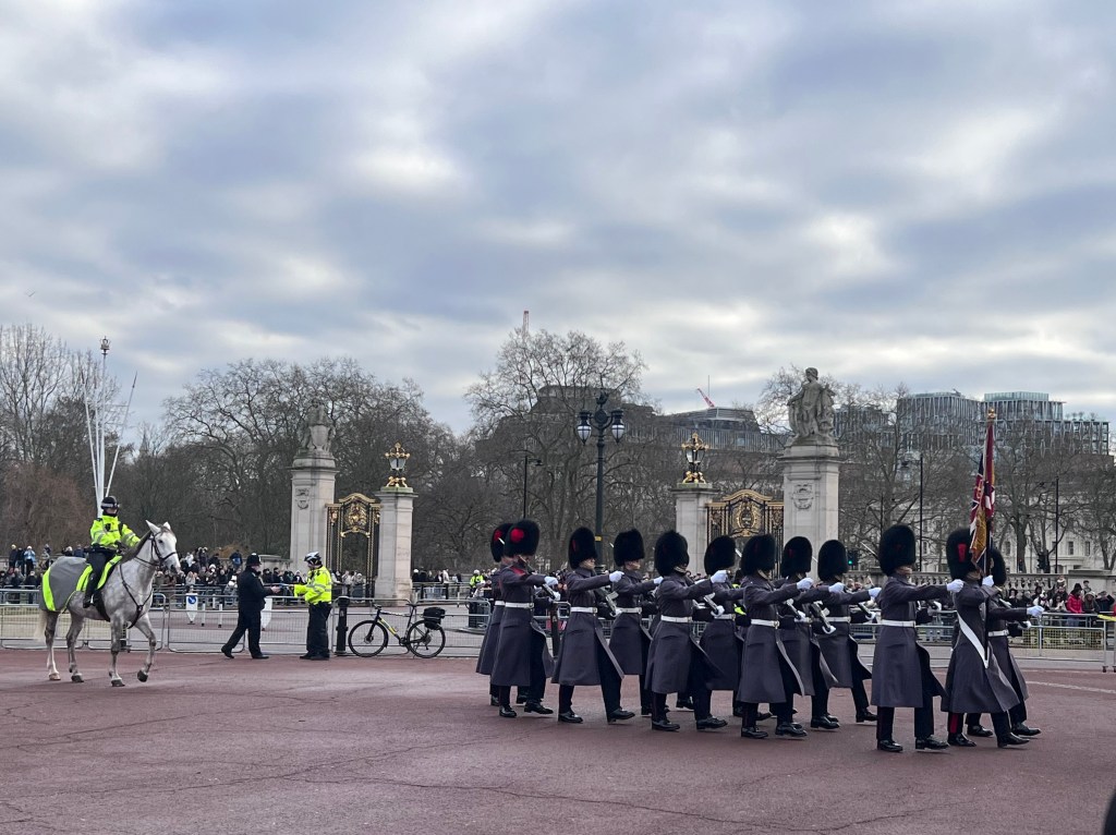 Unlike the treatment the military receives in America, the British Military is looked upon to the highest standards. That next morning after another quick breakfast, it was a short tube ride away and we were front and center at Buckingham Palace. After about 30 minutes of waiting, in the distance the sounds of a marching band could be heard. As the noise and anticipation grew with every second, it wasn’t long until the fanfare was right in front of us. It’s always unbelievable to see the extent the British military goes to for such an amazing ceremony. Its even more amazing that the unit in charge of guarding the king does this ceremony 4 times a week!! We asked a policeman where the horse guards were stationed for pictures, and walked in the direction of the British Parliament area is.